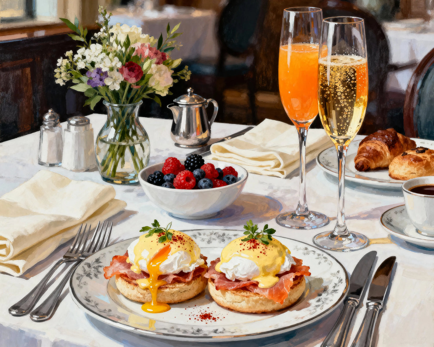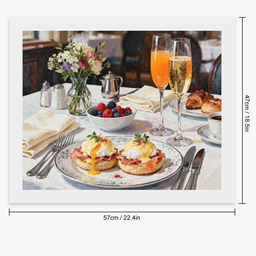 Each brushstroke reveals the warmth of a table bathed in light, the softness of the eggs, the sweetness of the sauces, and the elegance of the plates. Designed to calm the mind and stimulate creativity, this canvas invites a simple and refined sensory ritual.