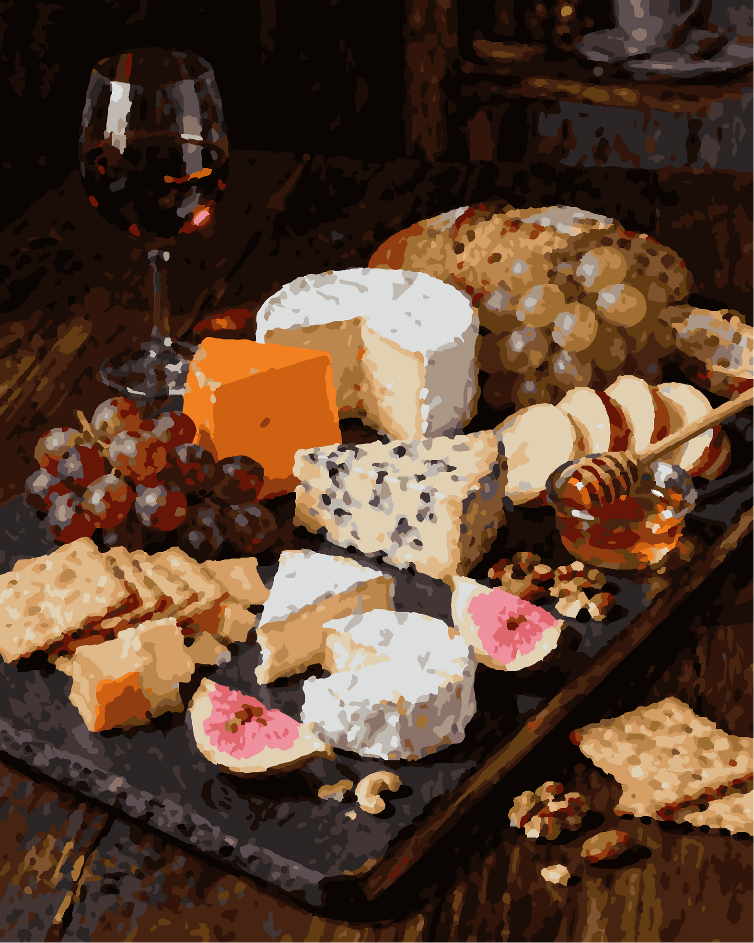 Steloria transforms a simple cheese platter into a sensual and warm work of art to paint yourself. This paint by numbers kit invites you to the softness of textures and delicious shades: wood grains, shadows of aged cheeses, warm reflections of leather or marble. Designed to beautify your table and offer a moment of soothing creation, it combines elegant design and immediate handling.