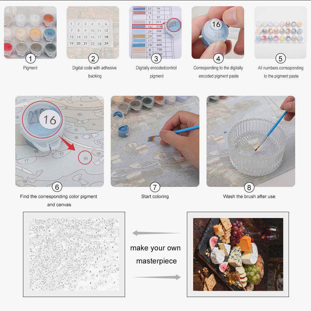 Painting a "cheese platter" Steloria is taking the time to savor each gesture. The numbered areas and pre-mixed colors guide you step by step to reveal a refined platter, worthy of a host's table.