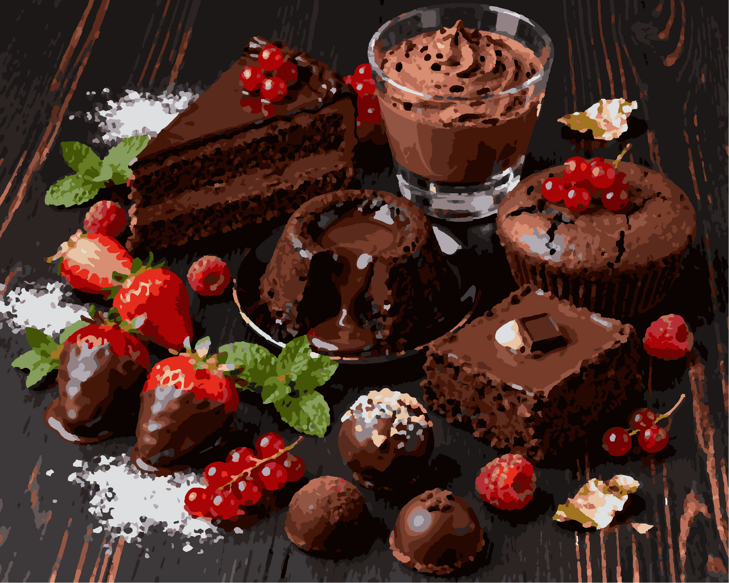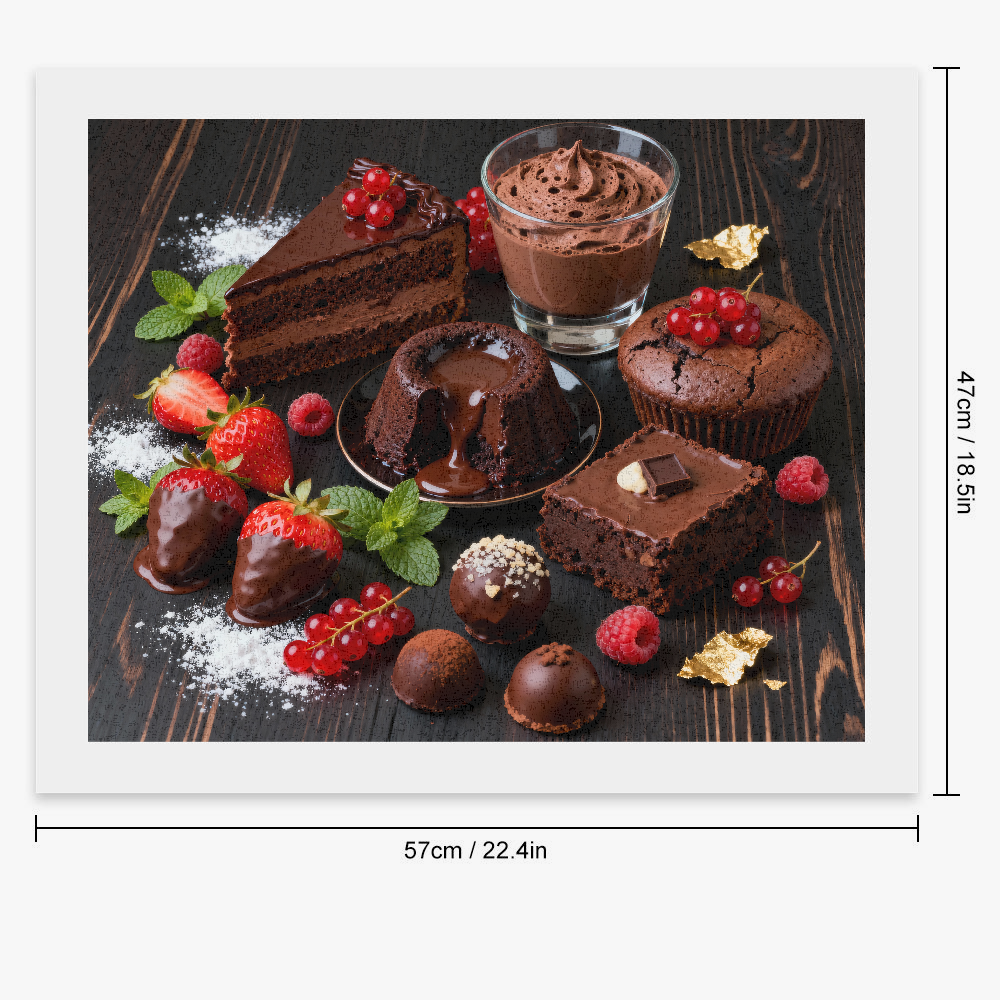 Each brushstroke reveals the depth of chocolate, the transparency of raspberries, and the freshness of strawberries. The carefully selected shades recreate the warmth and shine of the dessert, for a realistic and elegant result. Whether you are a beginner or experienced, the composition invites you to explore textures and contrasts, while cultivating a soothing and sensual experience.