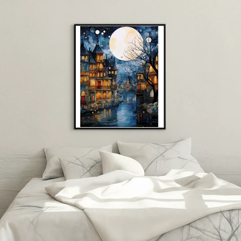 Immerse yourself in a nighttime scene where the moon reigns supreme and the rooftops reveal silver reflections. With the paint by numbers "City at night under a moonlit sky" by Steloria, every stroke becomes a caress, every color a glow that transforms a canvas into a living painting. This kit is designed to offer a sensual and soothing experience, ideal for moments when you want to slow down and create.