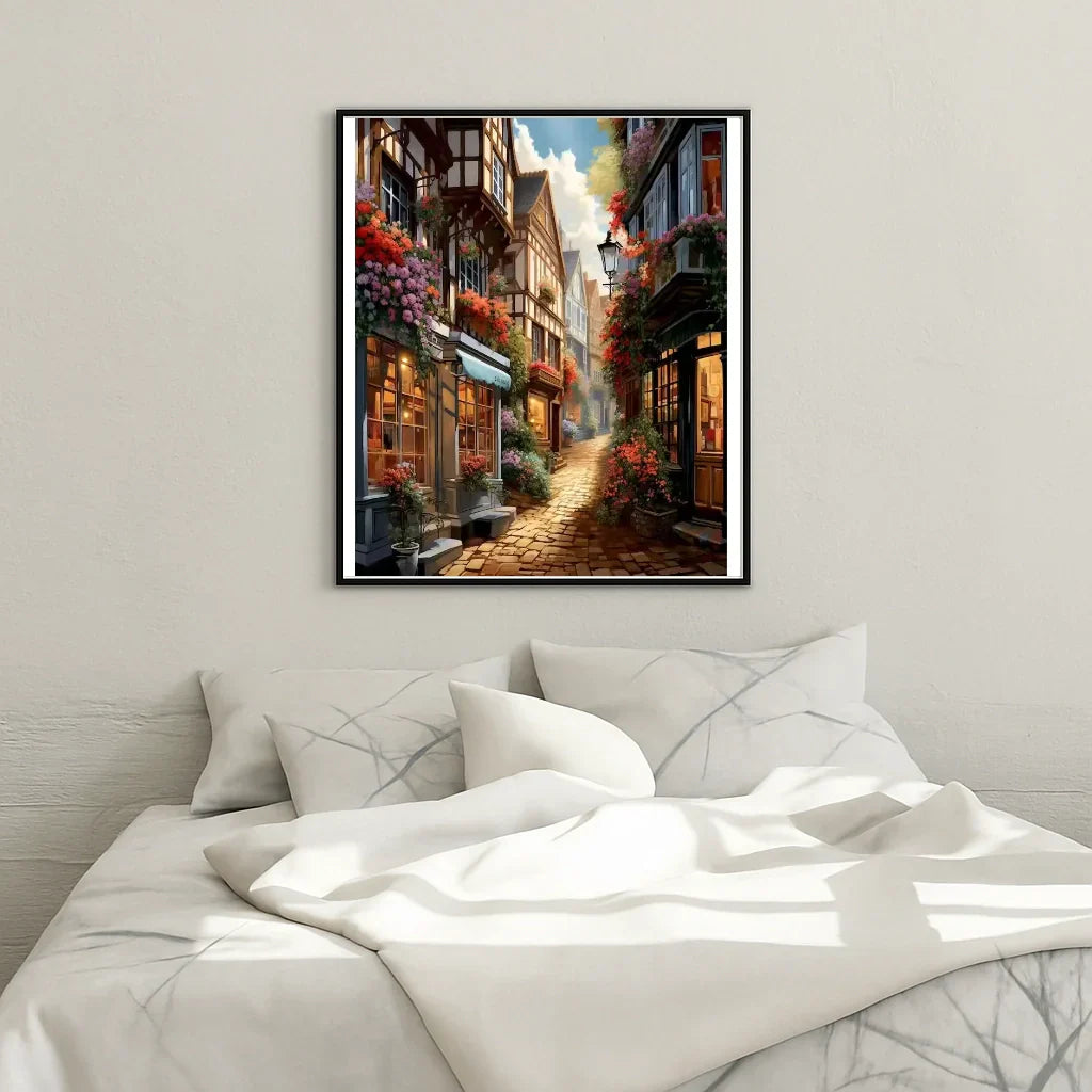 Indulge in a sensory journey at the heart of a shopping arcade lined with flowers, captured in soft and bright colors. This paint by numbers guides you step by step to reveal an elegant urban scene, where each shop breathes poetry and where the light caresses the cobblestones.