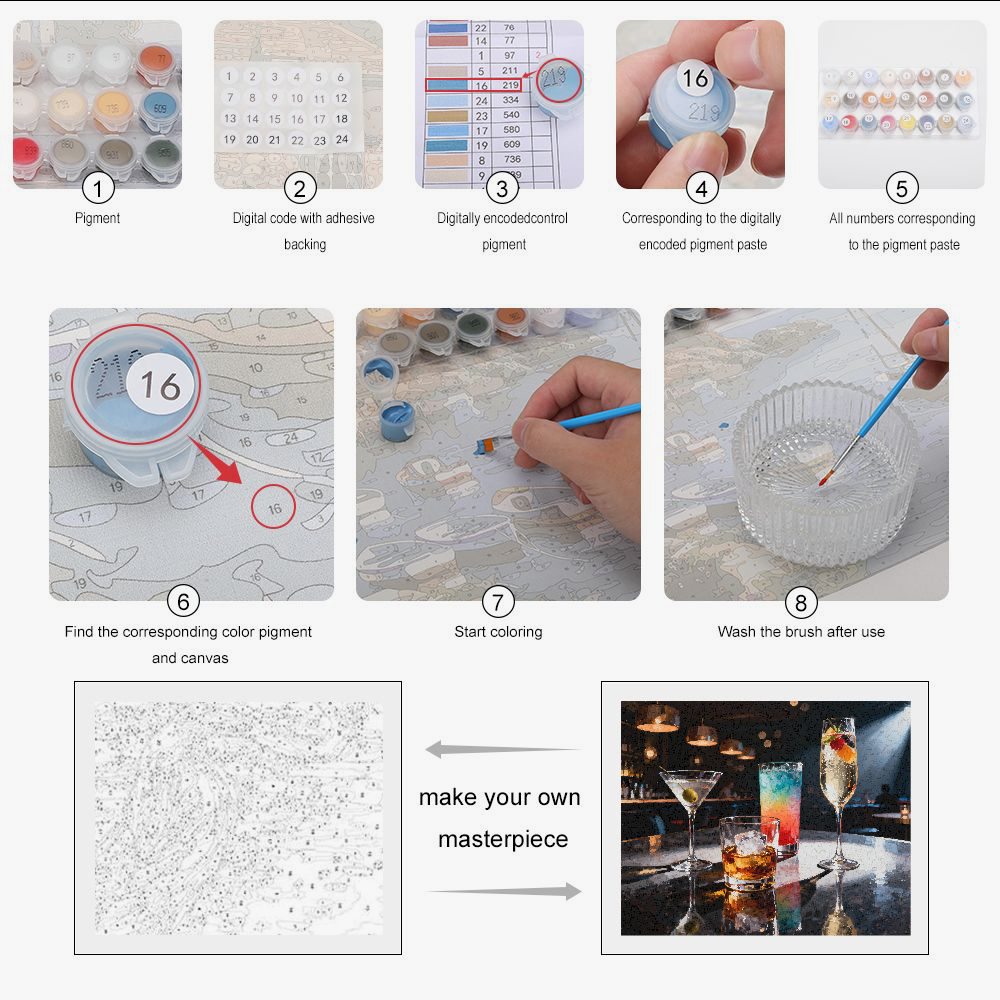 Each brushstroke reveals a detail: the curve of a glass, the shine of an olive, the smoothness of a counter. The paint by numbers makes it easy to create a work worthy of a cozy living room without prior experience. Ideal for:
