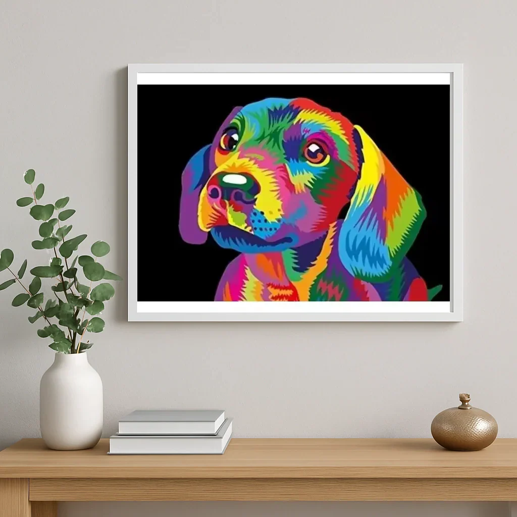 Discover "Dog-2 Pop Art", a paint by numbers artwork that combines bold colors and soft shapes. Designed by Steloria, this kit transforms a simple creative moment into a sensual and soothing experience. The bright and contrasting shades gradually reveal a dog full of character, ideal for enhancing a wall or giving a memorable gift.