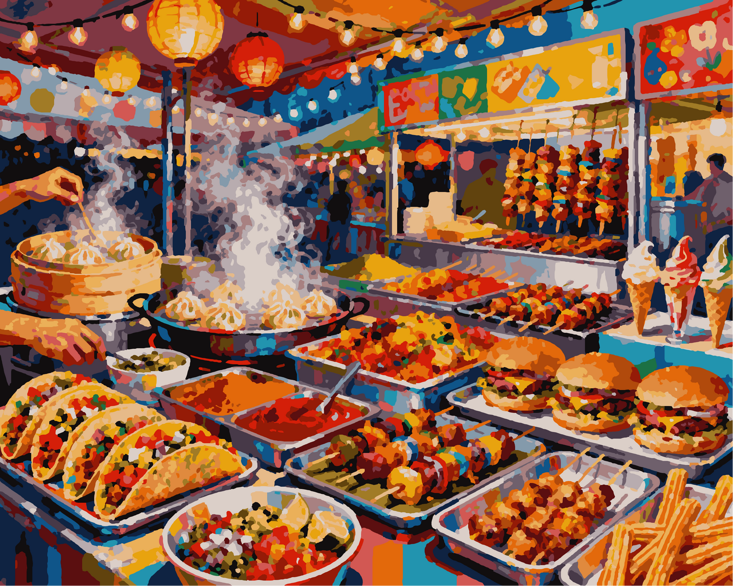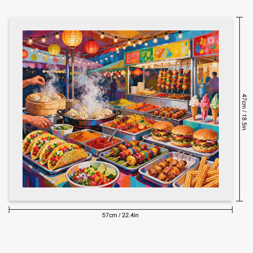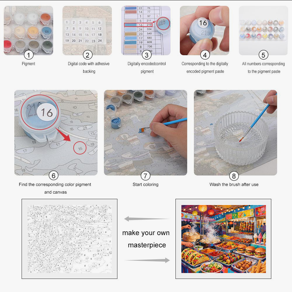 Steloria invites you on a colorful journey to the heart of urban flavors. This paint by numbers transforms the street food of the world into a sensual canvas: Mexican tacos, steaming ramen, golden falafels, markets of Asia and America reveal themselves in rich and harmonious shades. Simple, relaxing, and deeply satisfying, this creation is designed to awaken your senses and decorate your home with style.
