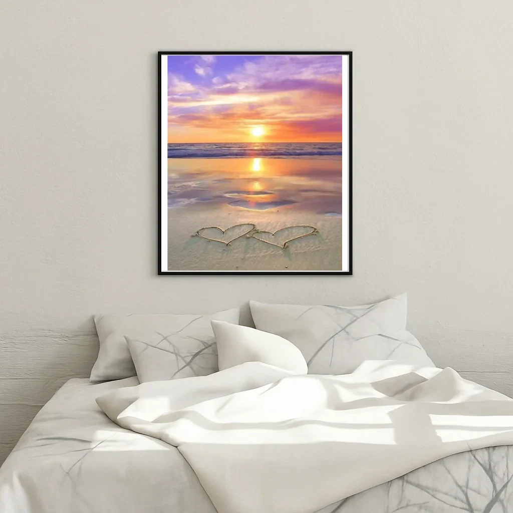 Immerse yourself in a tender and bright scene with this paint by numbers "Lovers' sunset - hearts on the sand". Every detail celebrates the suspended moment where the sea caresses the shore, where two silhouettes are outlined under a blazing sky.