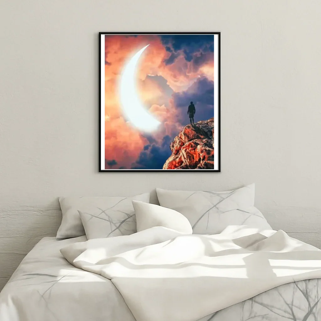 Immerse yourself in a sensual and nocturnal atmosphere with this paint by numbers artwork by Steloria. The man, captivated by a delicate crescent moon, invites daydreaming. Each brushstroke reveals the softness of shadows and the silvery glow of the sky, transforming a suspended moment into a personal work, accessible to all.
