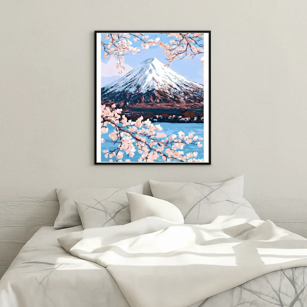 Whether you are a beginner or an experienced amateur, every brushstroke becomes a moment of pleasure. The intuitive numbered system and pre-printed canvas allow you to focus on color and texture, freeing the mind and stimulating creativity. The result is visually rich: the pink petals seem to float above the water, the Mount Fuji stands out in soft light - a composition that invites dreaming.