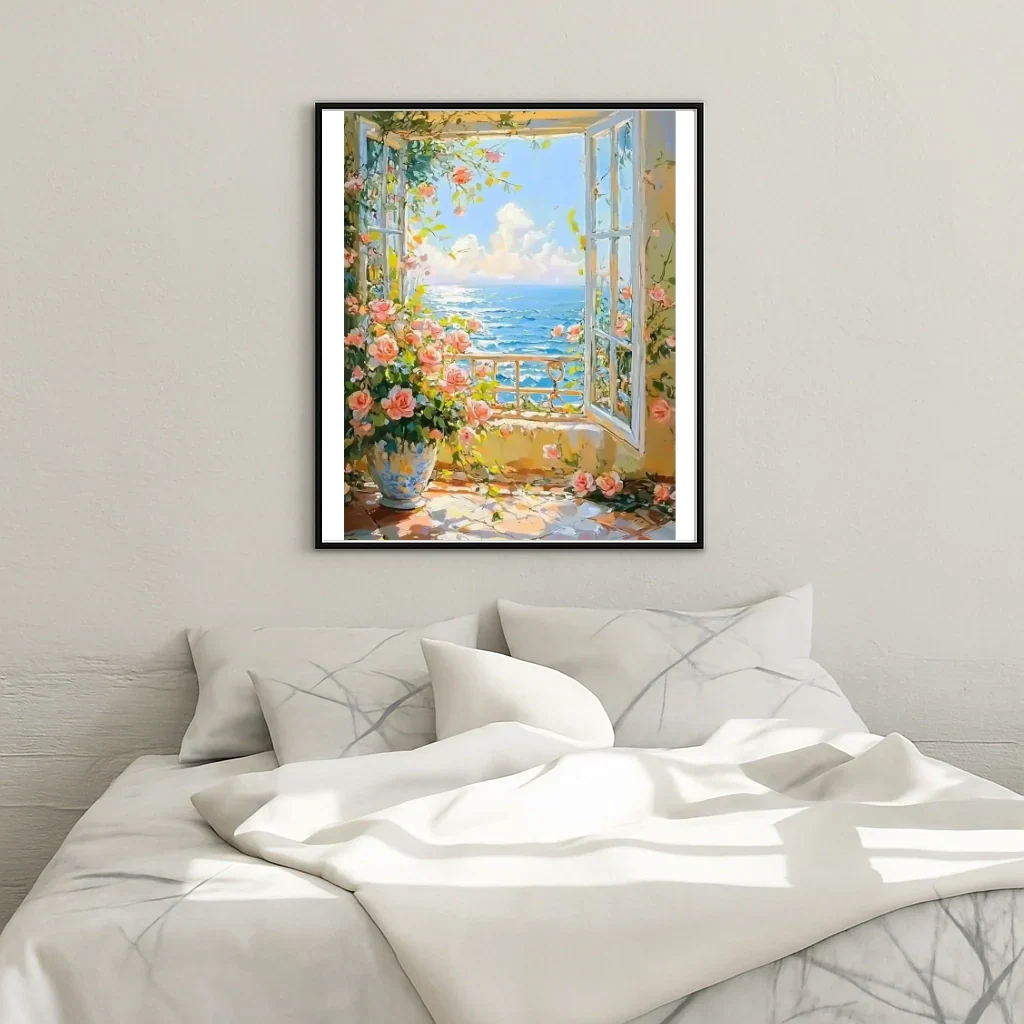 Dive into a salty breath and soft light with Steloria: "Window overlooking the ocean" transforms a marine moment into a personal work. Each stroke calls the breeze, each color reveals the whisper of the waves.