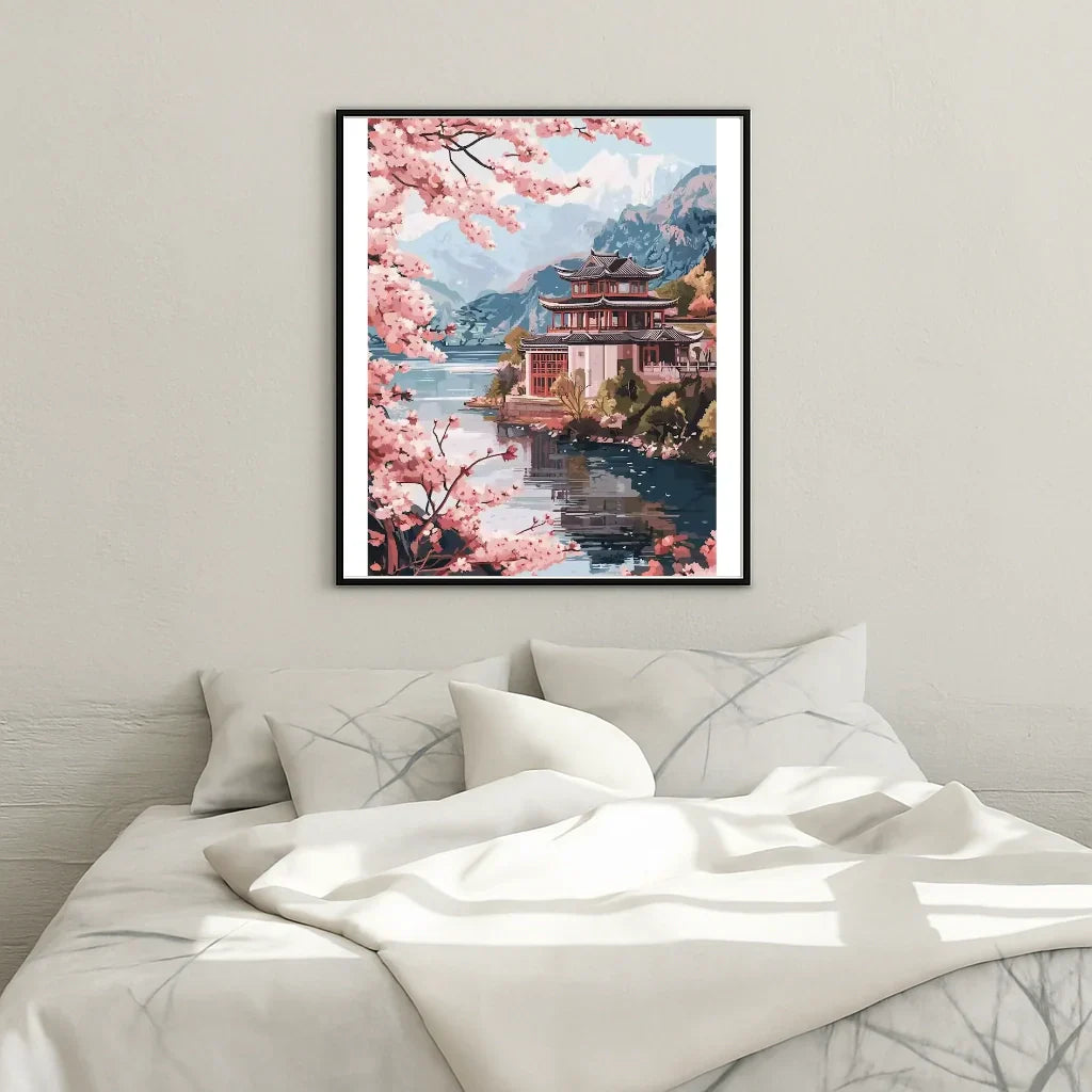 Immerse yourself in a calm and sensual journey with the Pagoda of Lake Fuji, a paint by numbers kit by Steloria. This Japanese scene, bathed in mist and golden light, transforms each brushstroke into a moment of serenity.