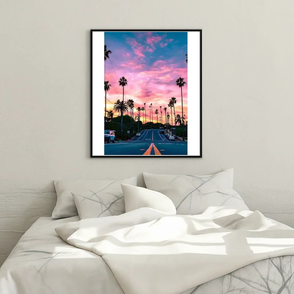 Immerse yourself in the softness of a tropical evening with the paint by numbers Steloria "Palm-lined street at sunset". Each brushstroke reveals a golden light that caresses the palm trees and transforms your canvas into a sensual and soothing scene.
