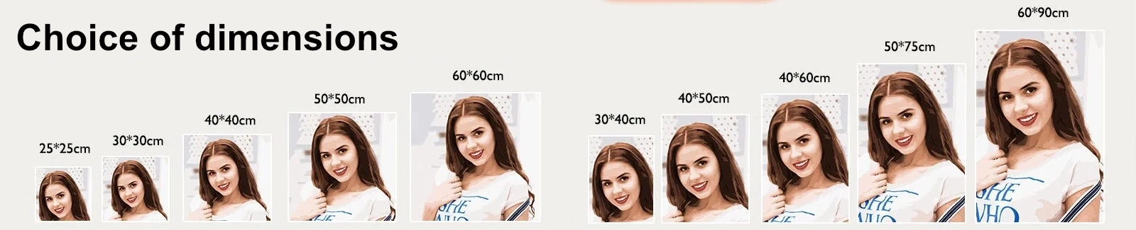 Dimensions : 20x20cm, 30x40cm, 40x40cm, 40x50cm, 40x60cm, 50x60cm, 50x70cm, 60x65cm, 60x90cm, 60x120cm et 70x100cm