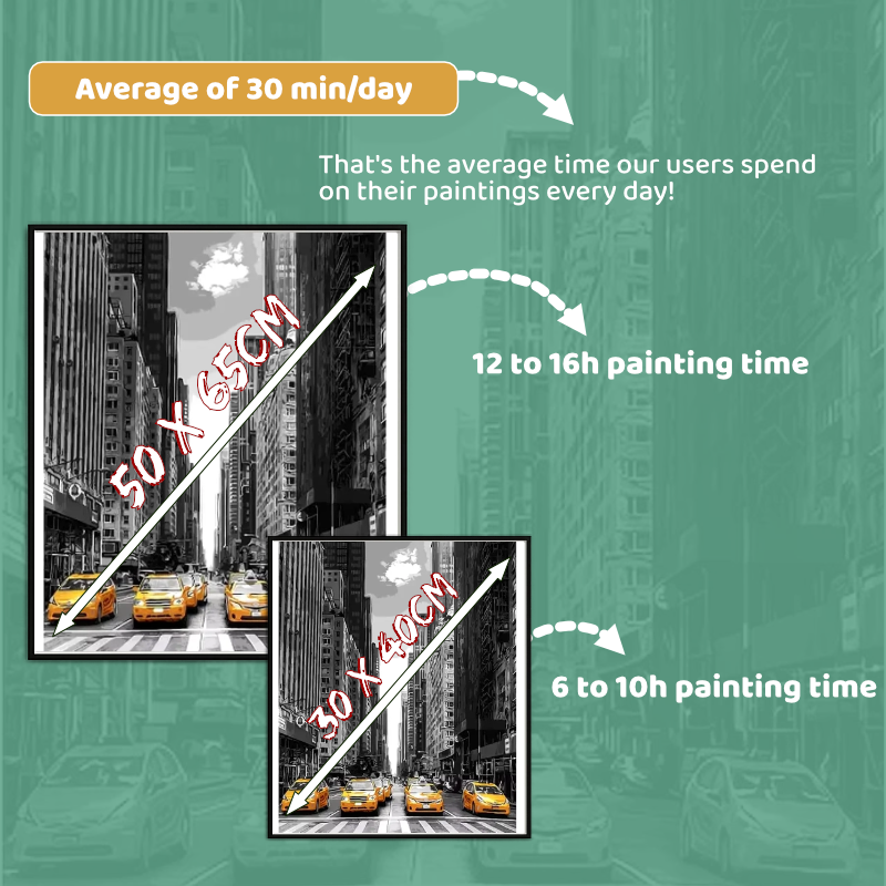 40×50 cm format: 6–10 hours on average. Larger formats or 48 colours will take longer (but will produce a more nuanced result).