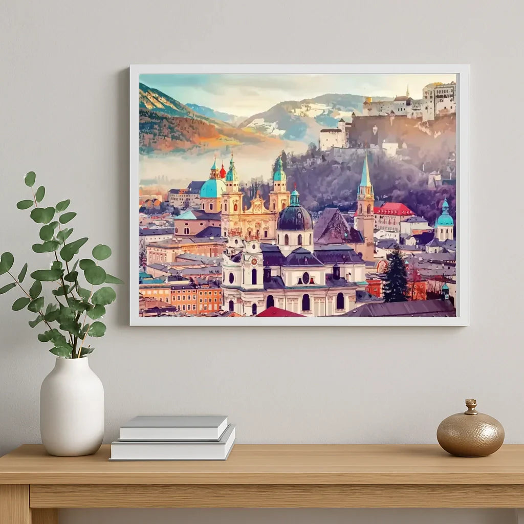 Dive into the muted atmosphere of Salzburg with this paint by numbers kit by Steloria. The scene captures the historic rooftops, the soft light on the steeples, and the peaceful reflection of a city that invites daydreaming. This painting transforms an afternoon into a sensory experience: stroke by stroke, the colors bloom and the city comes to life under your fingers.