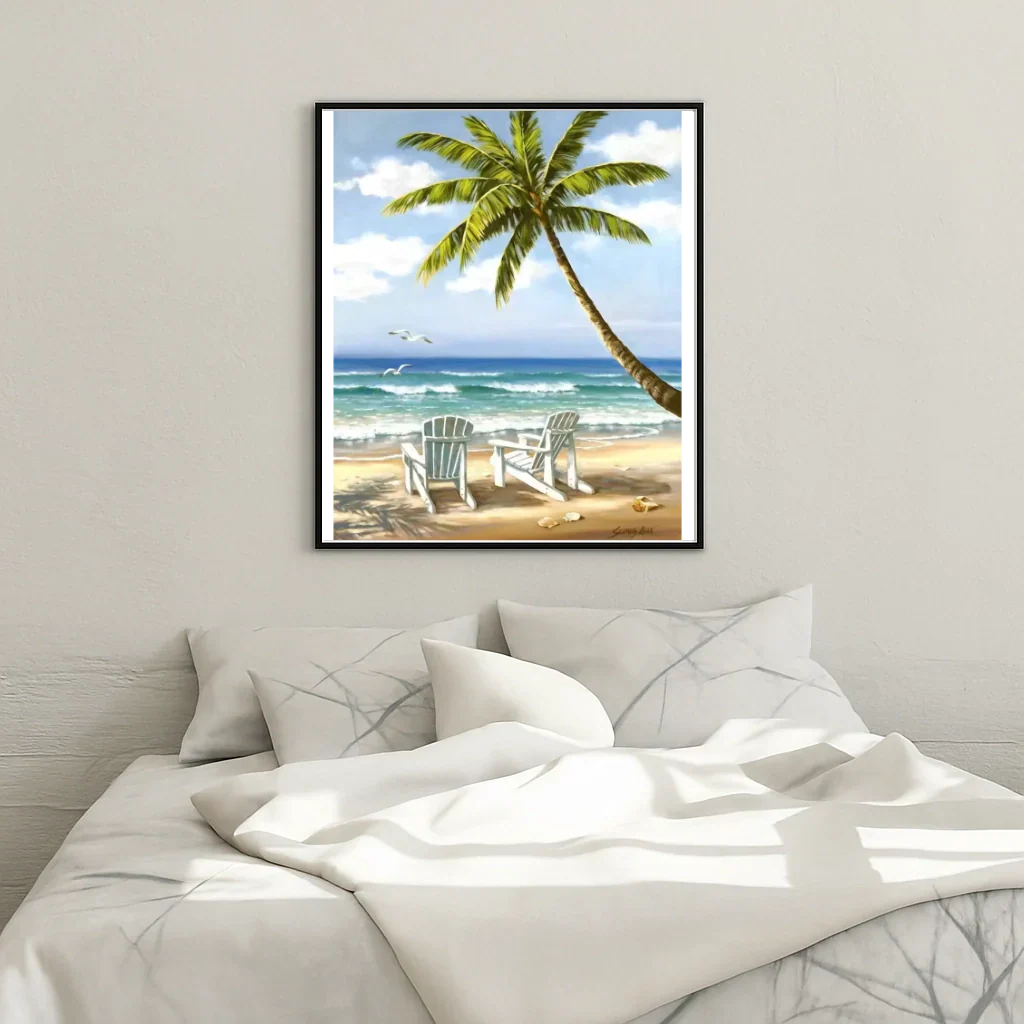 Immerse yourself in a sensual interlude with "Sun loungers on a tropical beach" by Steloria. This paint by numbers kit transforms an afternoon into a journey: the warm breath of the palms, the whisper of the waves, and the golden light on the sun loungers take shape under your fingers.