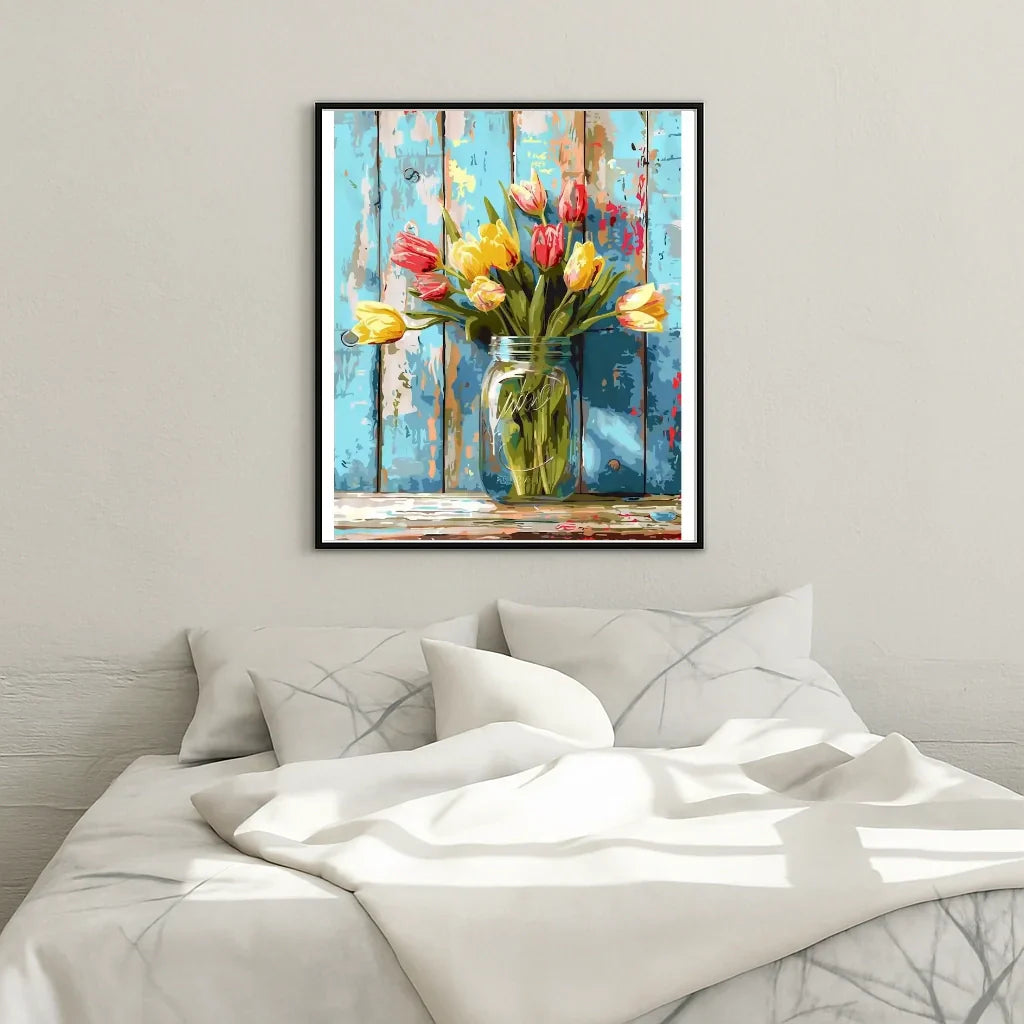 Steloria invites you to experience a creative and sensual moment with this paint by numbers depicting a bunch of tulips delicately placed in a jar. Designed to offer a moment of relaxation and an elegant result, this kit transforms a simple activity into a refined decorative object. The soft palette, clean shapes, and satin finish will enhance your interior or that of a loved one.