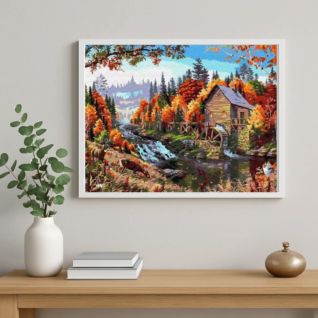 Each brushstroke is a caress. The gesture becomes meditation, the choice of colors warms the soul. You will see the mill reveal itself, the water sparkle, and the forest blaze under your hands. This kit invites you to slow down, to savor the creative flow, and to create a decorative piece full of emotion.